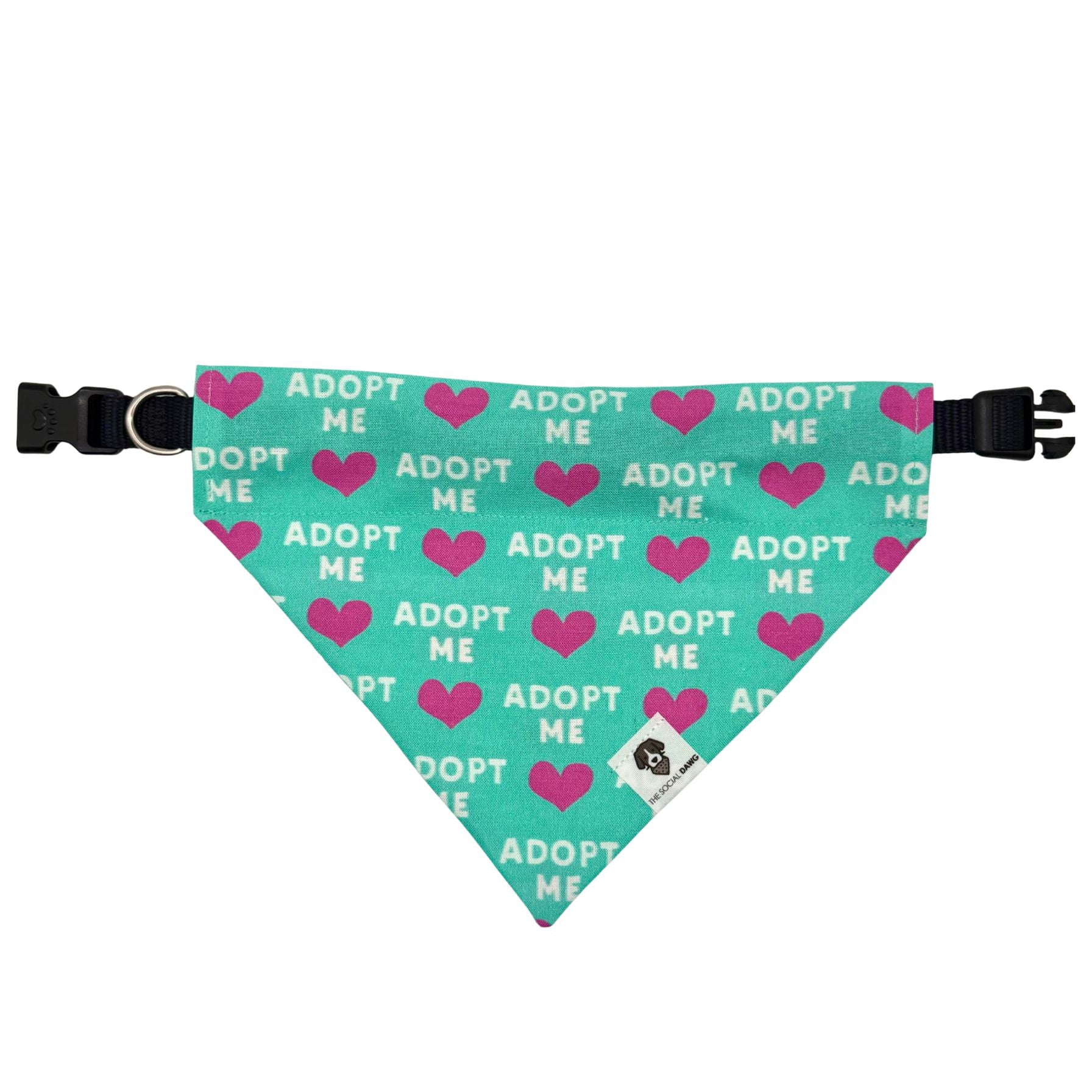 Every pet deserves a happy life and a loving home. Our Adopt Me bandana is a must-have for rescued pups ready to steal hearts. With white lettering and playful pink hearts on a teal background, it’s equal parts cute, meaningful, and impossible to resist.